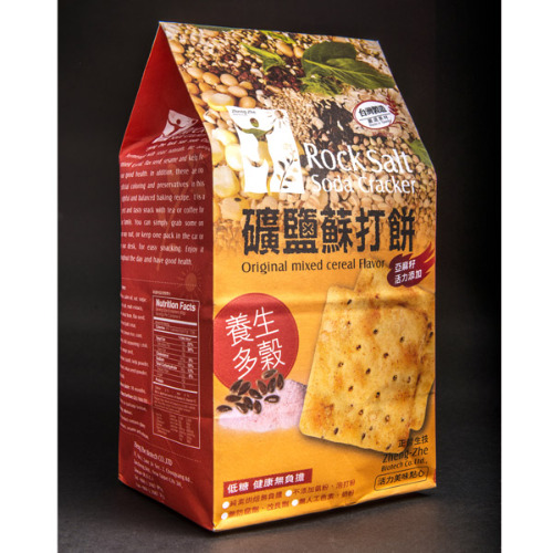 原料:小麥麵粉、棕梠油、燕麥片、糖、酵母粉、黑胡椒、礦鹽、麥芽抽出液、白芝麻、亞麻籽、乾酵母、穀粉(薏仁、蕎麥、糙米、玉米、黃豆)、唐辛子調味粉(辣椒、黑芝麻、白芝麻、桔皮、花椒、羅勒)、昆布粉、碳酸氫鈉(小蘇打)、黑豆粉、蓮子粉。